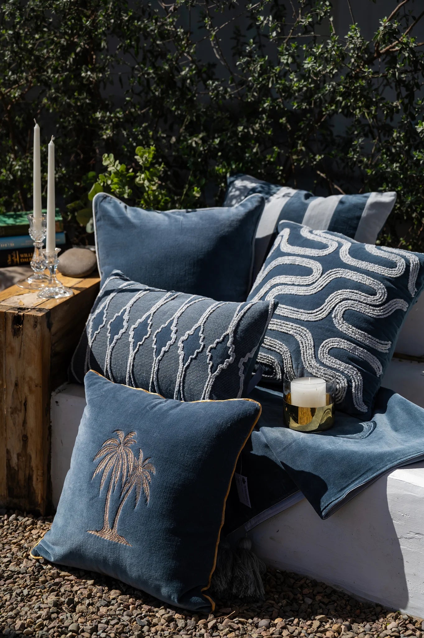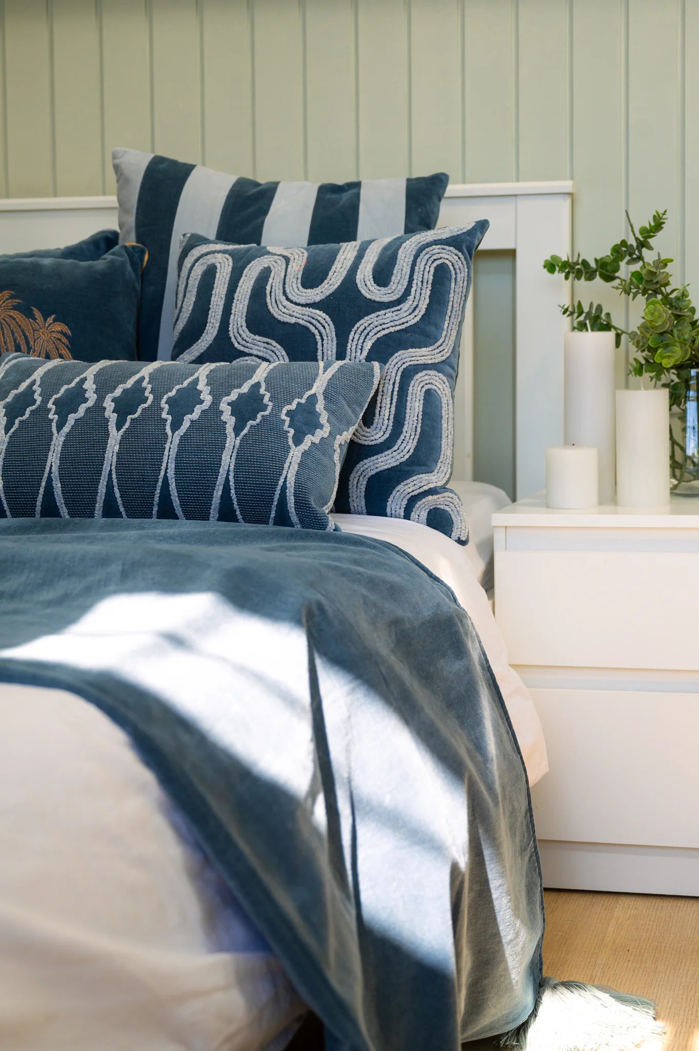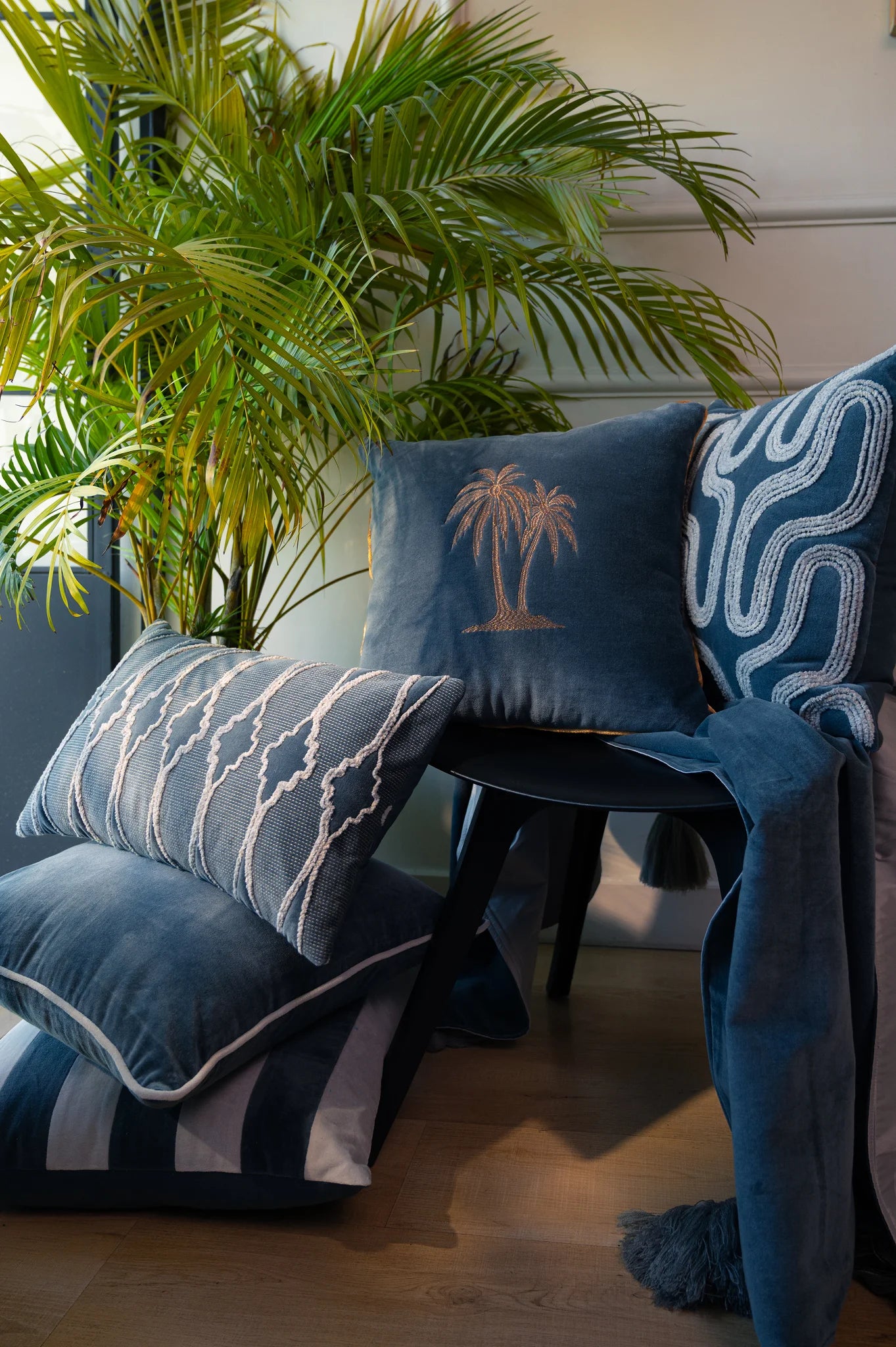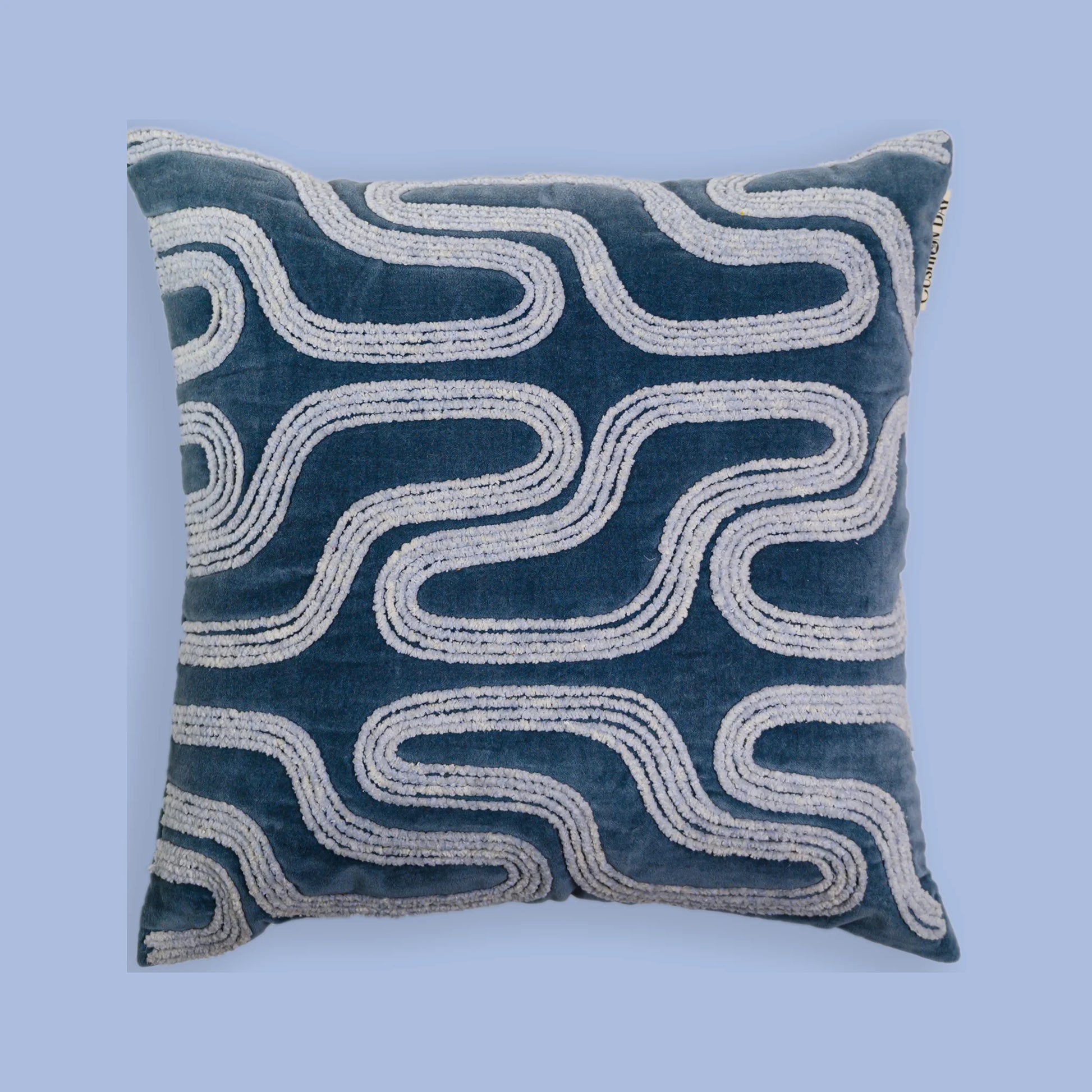 Inspirert av Geirangerfjordens skjønnhet, fanger denne velourputen den samme rolige elegansen i sitt design. Den dype gråblå tonen gir en jordnær følelse av ro, mens elegante håndbroderte linjer i kremhvitt tilfører en myk, leken rytme.