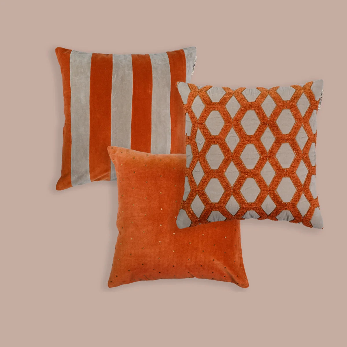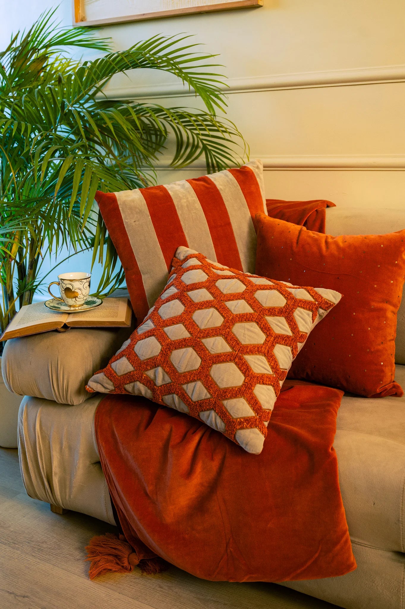 Ro-kolleksjonen samler Harmoni, Vevro og Lykke – en trio av fløyelstrekk skapt for varme, tekstur og tidløs nordisk eleganse. Harmoni utmerker seg med brede striper i rust og grått for et balansert, moderne uttrykk, mens Vevro tilfører dybde og struktur gjennom sitt geometriske mønster. Lykke fullfører helheten med en subtil, festlig glød – delikat prydet med fine paljetter som fanger lyset på en myk og elegant måte.