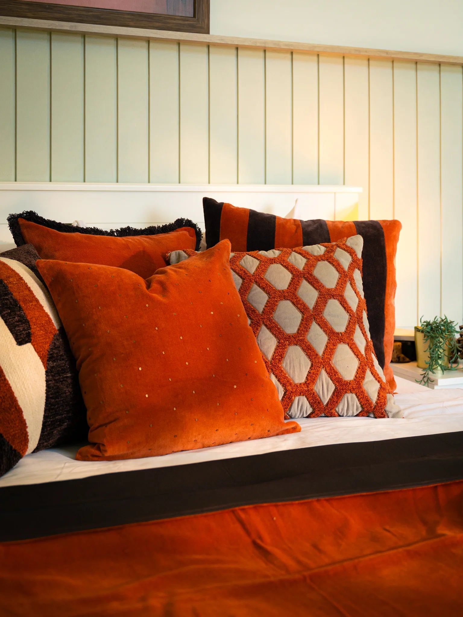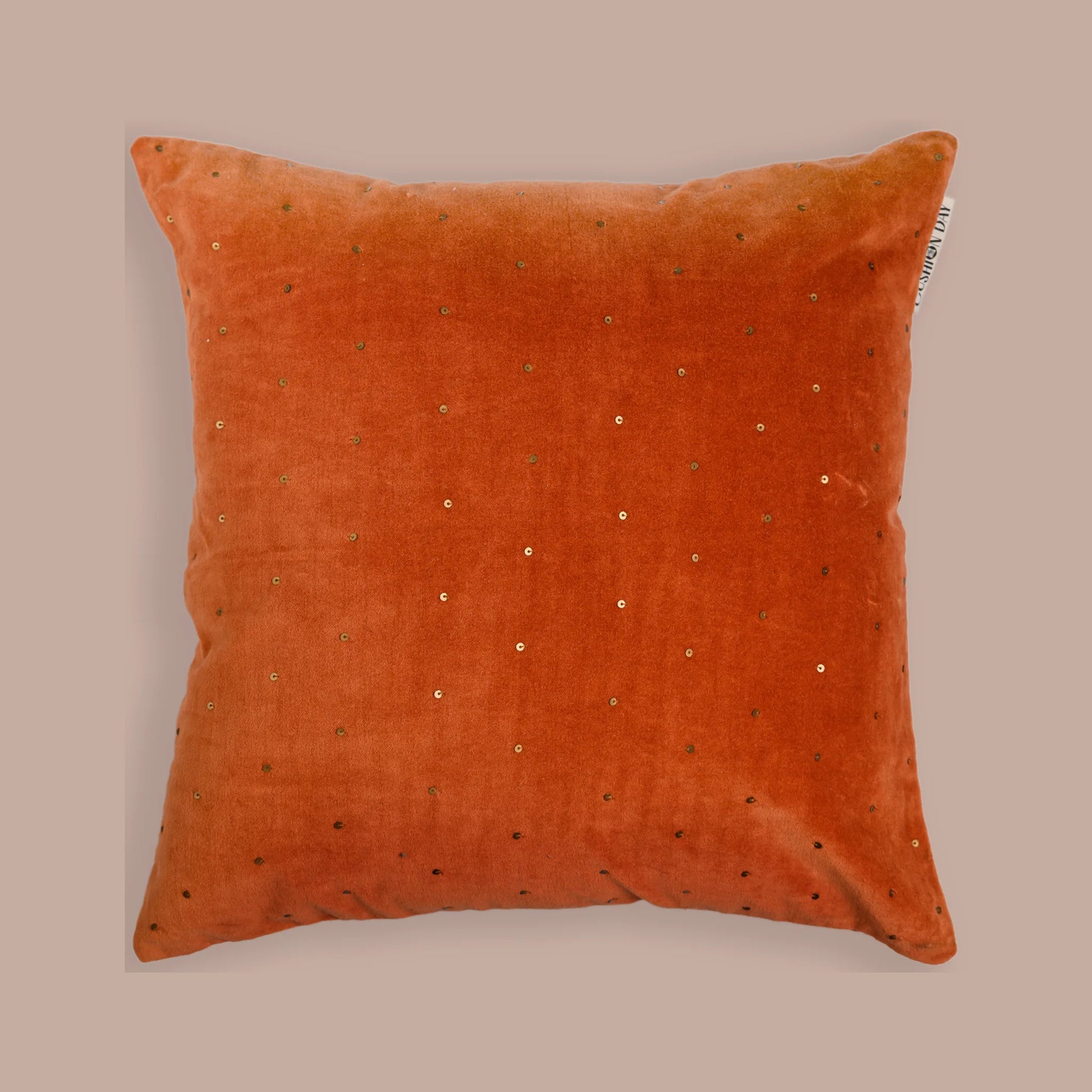 Lykke Putetrekk Størrelse (cm): 45×45 Materiale: Bomullsfløyel Type/Detaljer: Gullpaljetter og håndbroderi Farge / Nyanse: Rust / brent oransje Inspirasjon: Norsk høstnatur Sertifisering: OEKO-TEX® Anbefalte rom: Soverom, Stue, Lobby, Gjesterom, Lesekrok, Uteplass, Spisestue