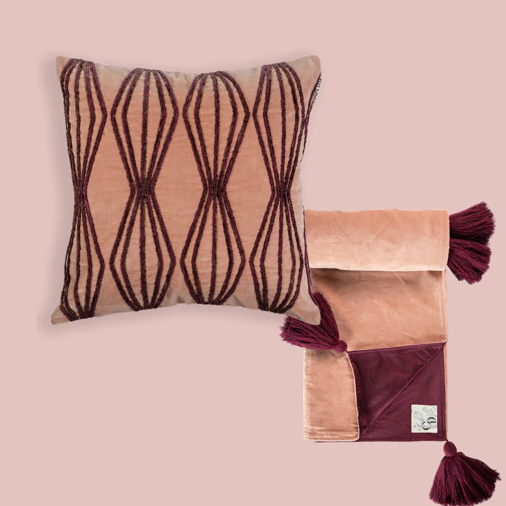Kveldsbris Ppute & Ly Pledd Sett bringer nordisk interiør til live med sin balanserte kombinasjon av håndverk og ro. Pynteputen, med håndbroderte geometriske mønstre i dype mokkatoner, møter det myke pyntepleddet i rose- og vinnyanser – både innbydende og raffinert.