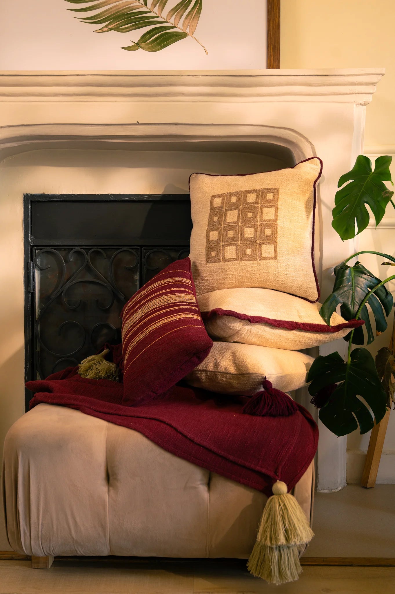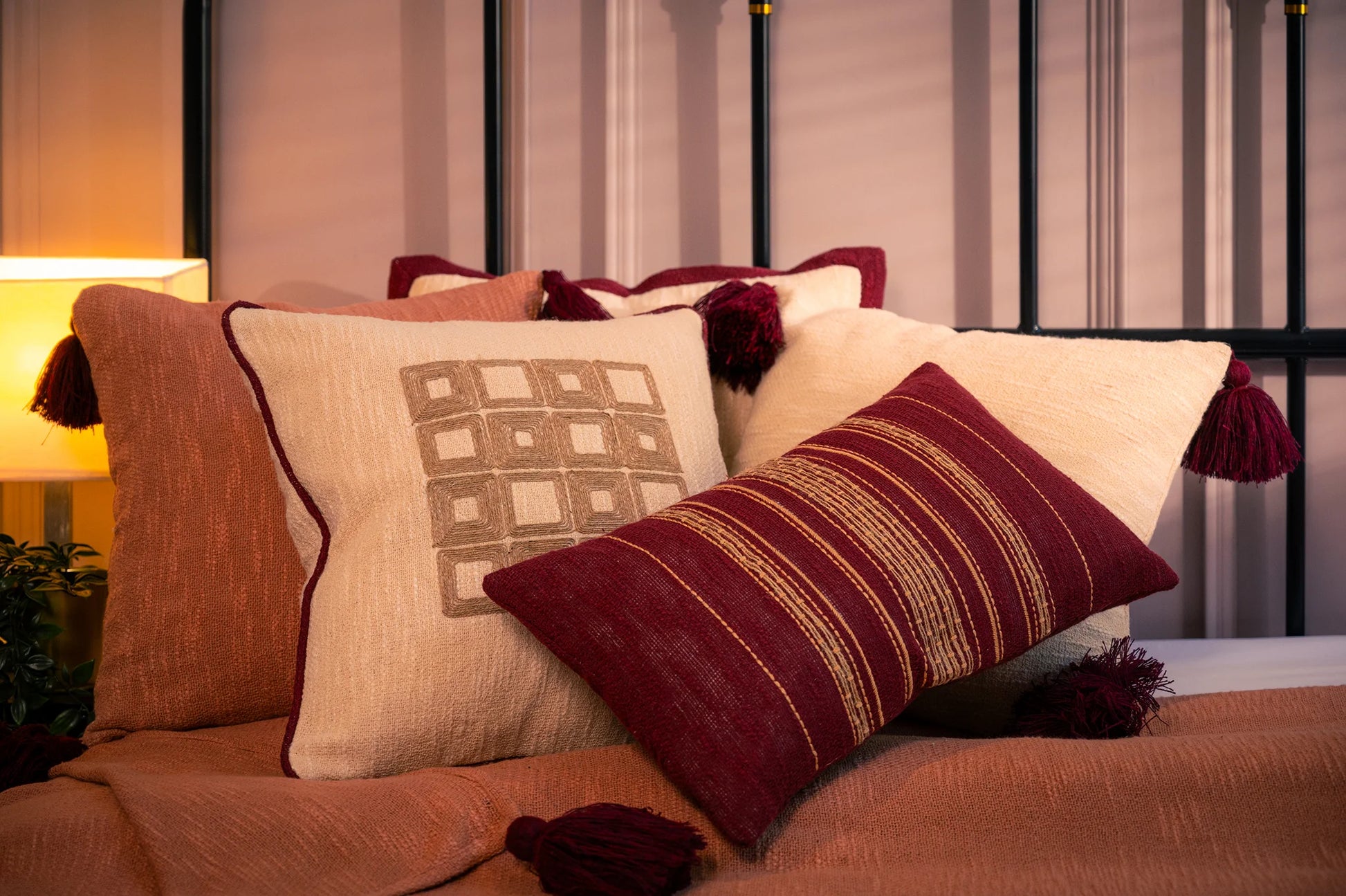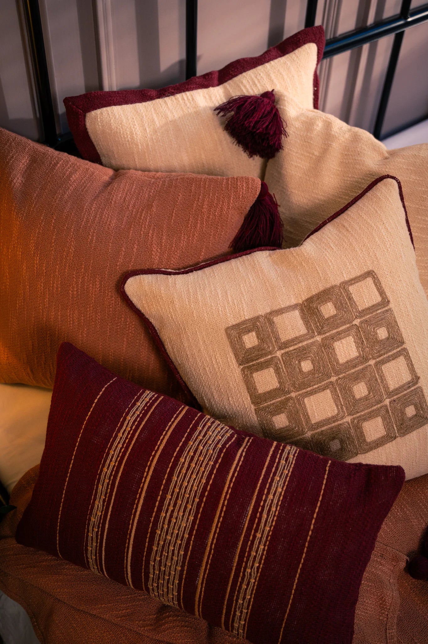 Linde bringer varme, dybde og et snev av nostalgi til et moderne interiør. Dens rike rustrøde base og fine, håndvevde striper i jordfarger skaper en naturlig rytme – perfekt til friske høstkvelder. Laget av mykt, teksturert stoff, tilfører denne pynteputen både karakter og komfort til ethvert rom.