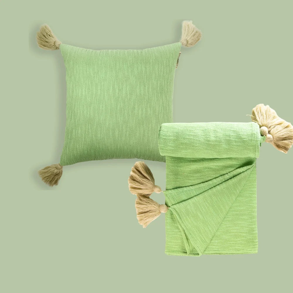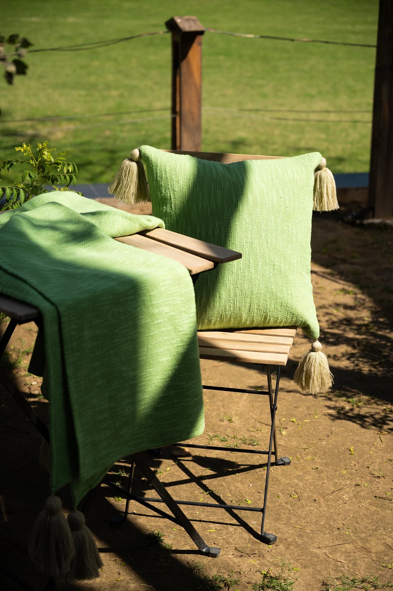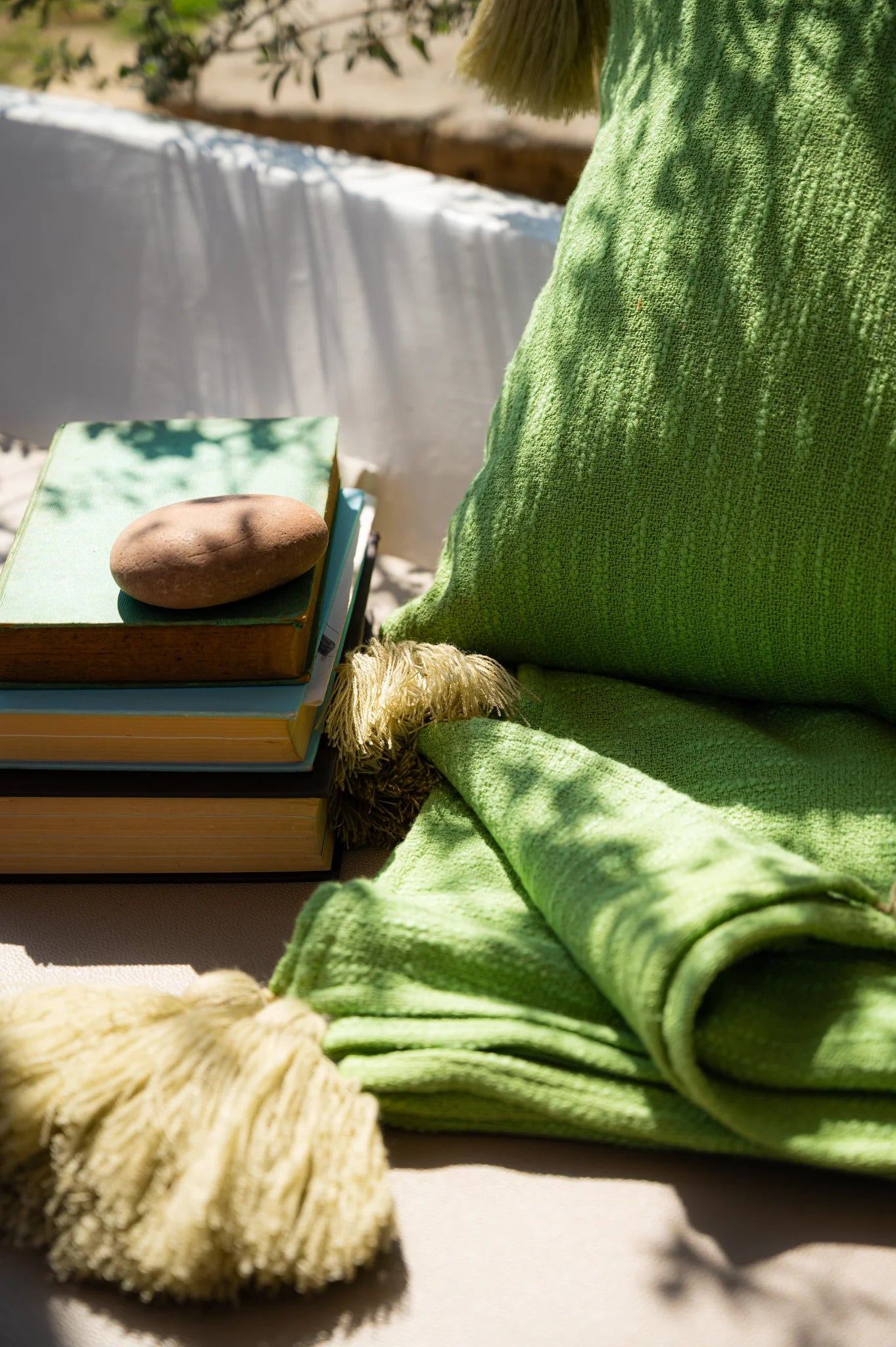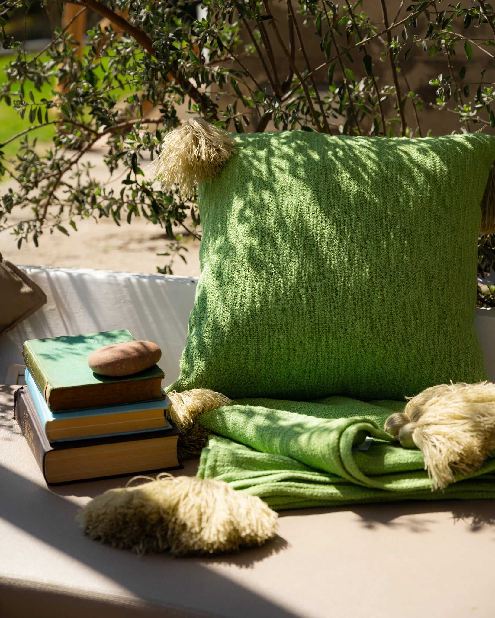Lyng-pynteputen og Hygge-pyntepleddet bringer myk tekstur og naturlige fargetoner inn i hjemmet ditt. Lyng, fra Jordvarm-kolleksjonen, har en dempet grønn nyanse med håndsydde dusker i hvert hjørne – en perfekt balanse mellom lekenhet og skandinavisk ro. Hygge-pyntepleddet matcher i både tone og tekstur, lett og pustende, avsluttet med håndknutte frynser som tilfører et snev av varme til rommet ditt.