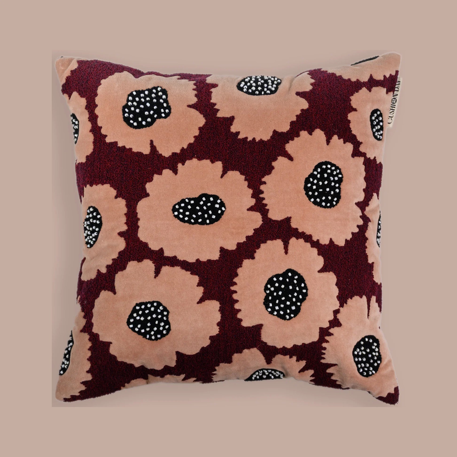 Rosenatt bringer et snev av personlighet til et rolig nordisk interiør. Dette putetrekket har et håndbrodert blomstermotiv liggende elegant over en dyp vinrød velourbase, i skjønn harmoni med mocha mousse og sorte toner. Resultatet er en pyntepute som er myk, personlig og full av varme.