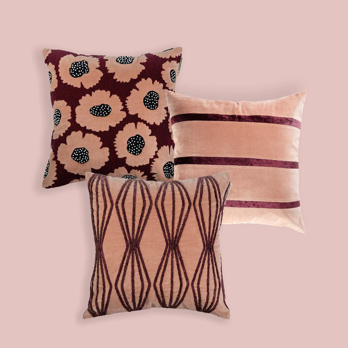 Mocha Mousse Putesett samler tre distinkte pynteputer som kombinerer tekstur, dybde og karakter. Himmelblush-puten har fløyelstriper på en mokkafarget base, og byr på et mykt skinn og en taktil finish. Kveldsbris-puten tilfører dybde med håndbroderte detaljer i rike burgundertoner, mens Rosenatt-puten introduserer dristige blomstermønstre som skaper et subtilt, men uttrykksfullt preg.