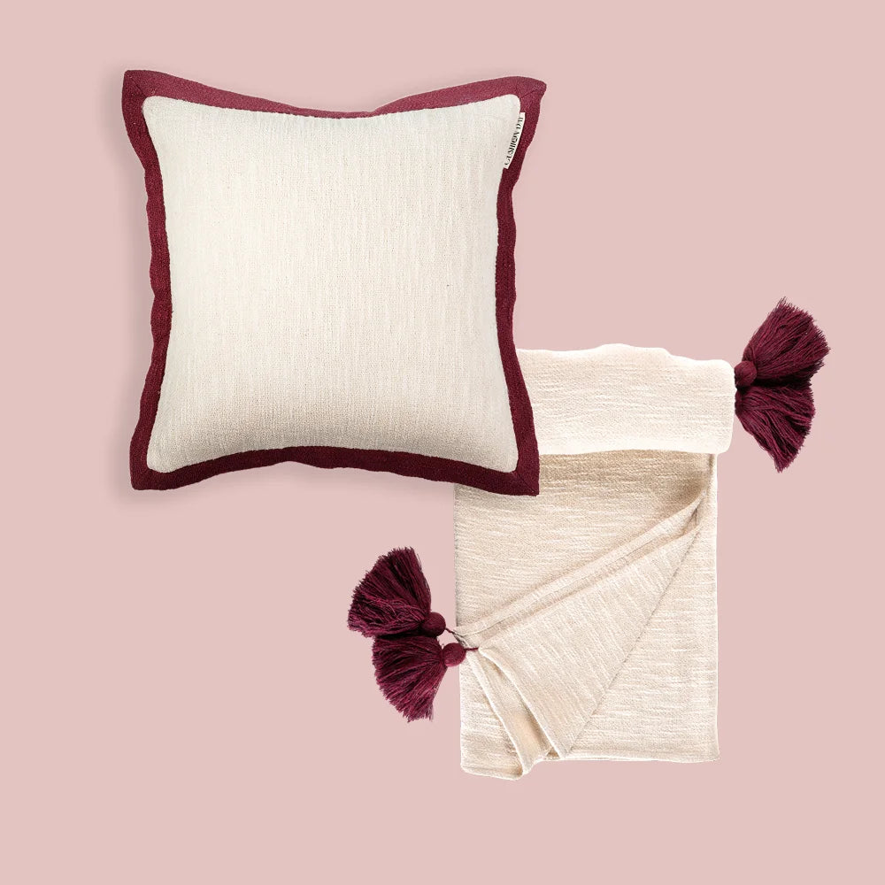 Siv & Hygge Sett gjenspeiler nordisk minimalisme. Siv-putetrekket fra Jordvarm-kolleksjonen kombinerer en myk, naturlig beige front med en dyp vinrød kant, og skaper en kontrast som føles ren og perfekt tilpasset norske interiører. Sammen med Hygge-pleddet, laget i teksturert stoff med håndknutte dusker, tilfører dette settet en stille karakter til sofaen eller sengen din.