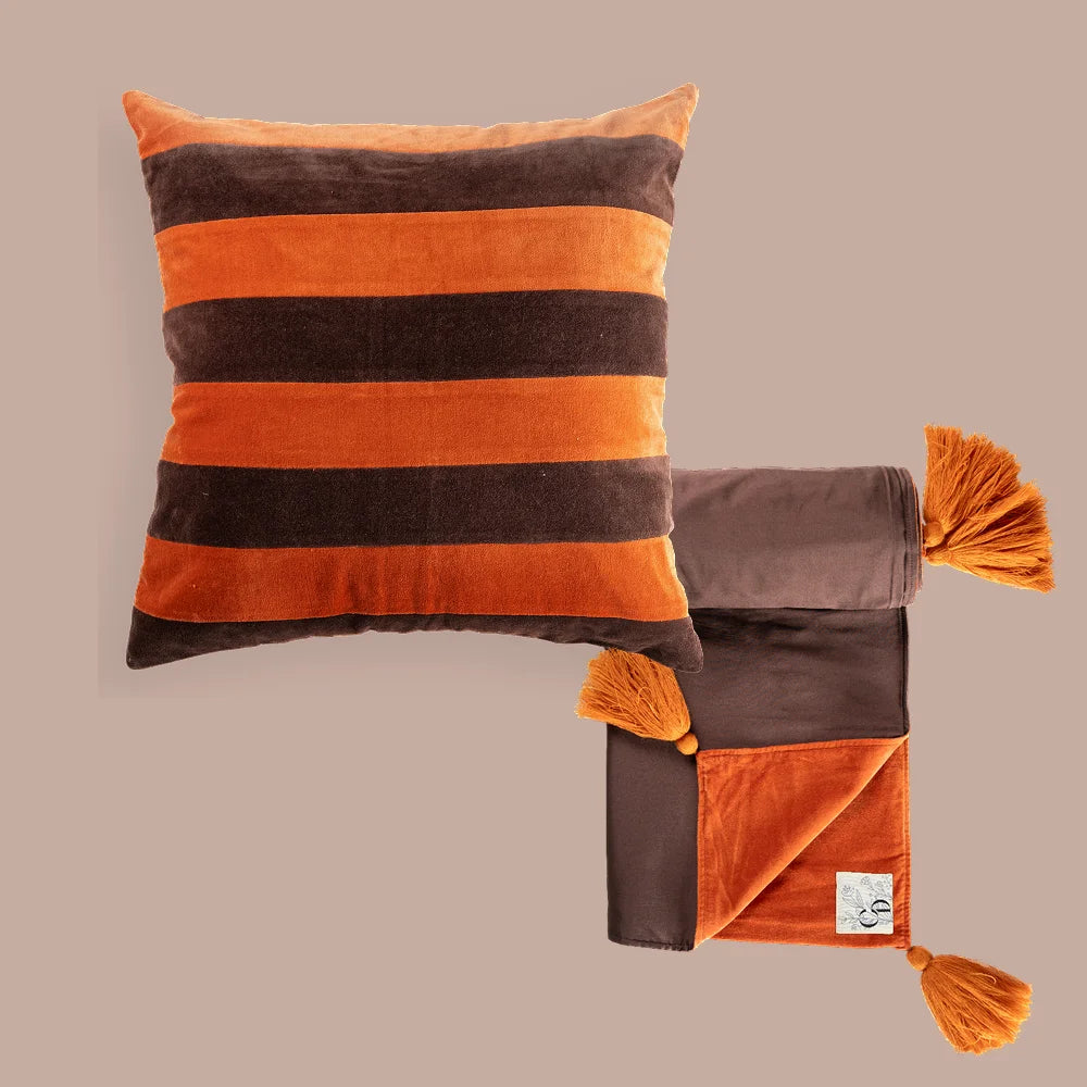 Symfoni-fløyelsputen og Ly-pyntepleddet møtes i en rik, jordnær harmoni designet for å løfte moderne, nordiske interiører. Symfoni utmerker seg med brede striper i rust og dyp brun bomullsfløyel, og tilfører varme, balanse og en dristig, men raffinert tilstedeværelse. Ly-pyntepleddet komplementerer den perfekt – laget i vendbar fløyel med håndknutte dusker for en elegant finish.