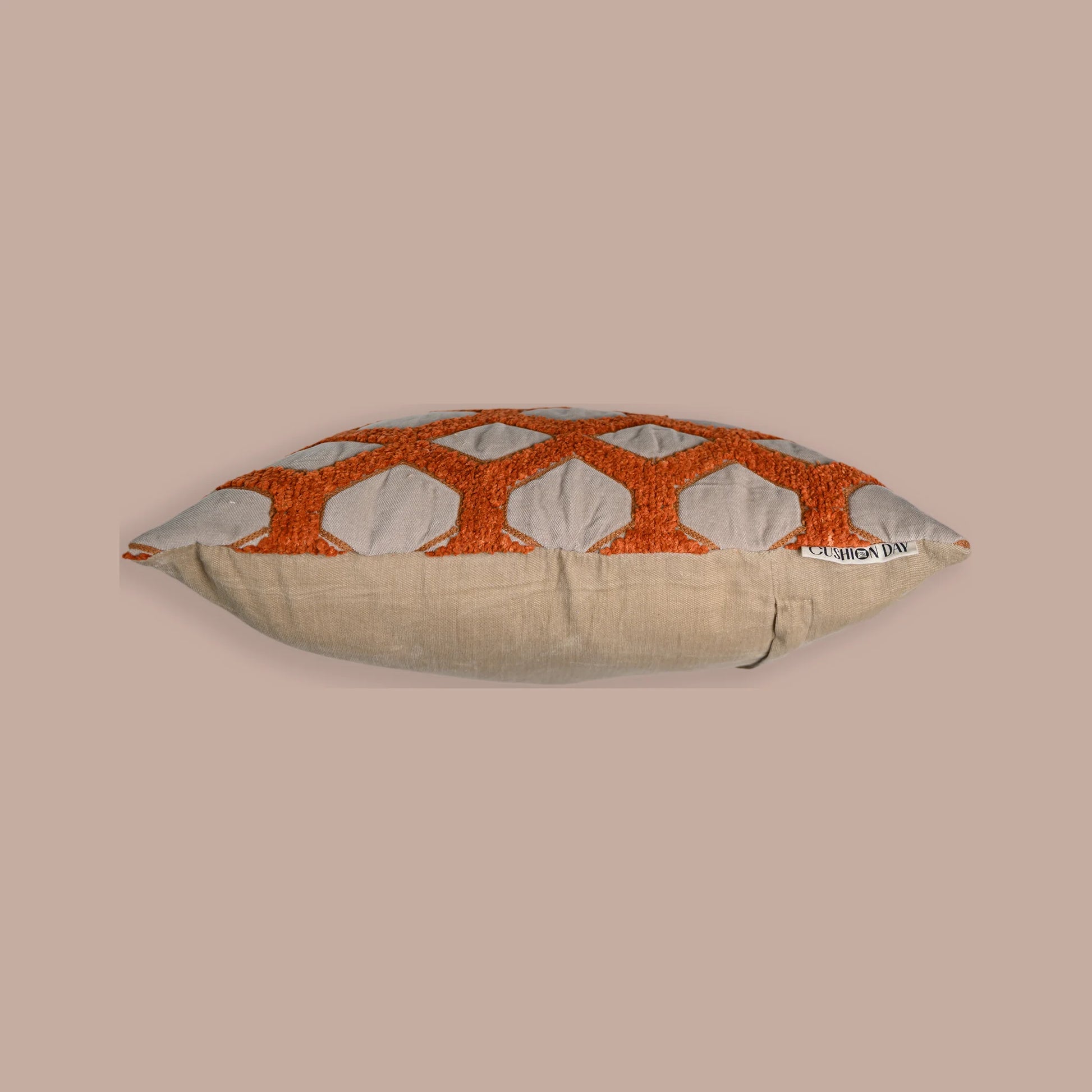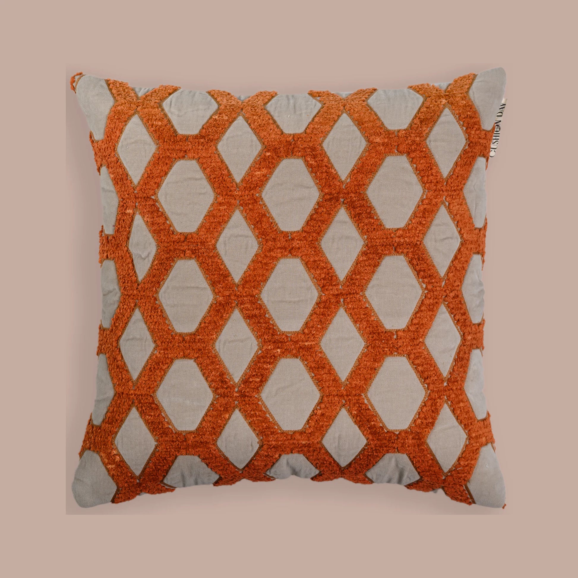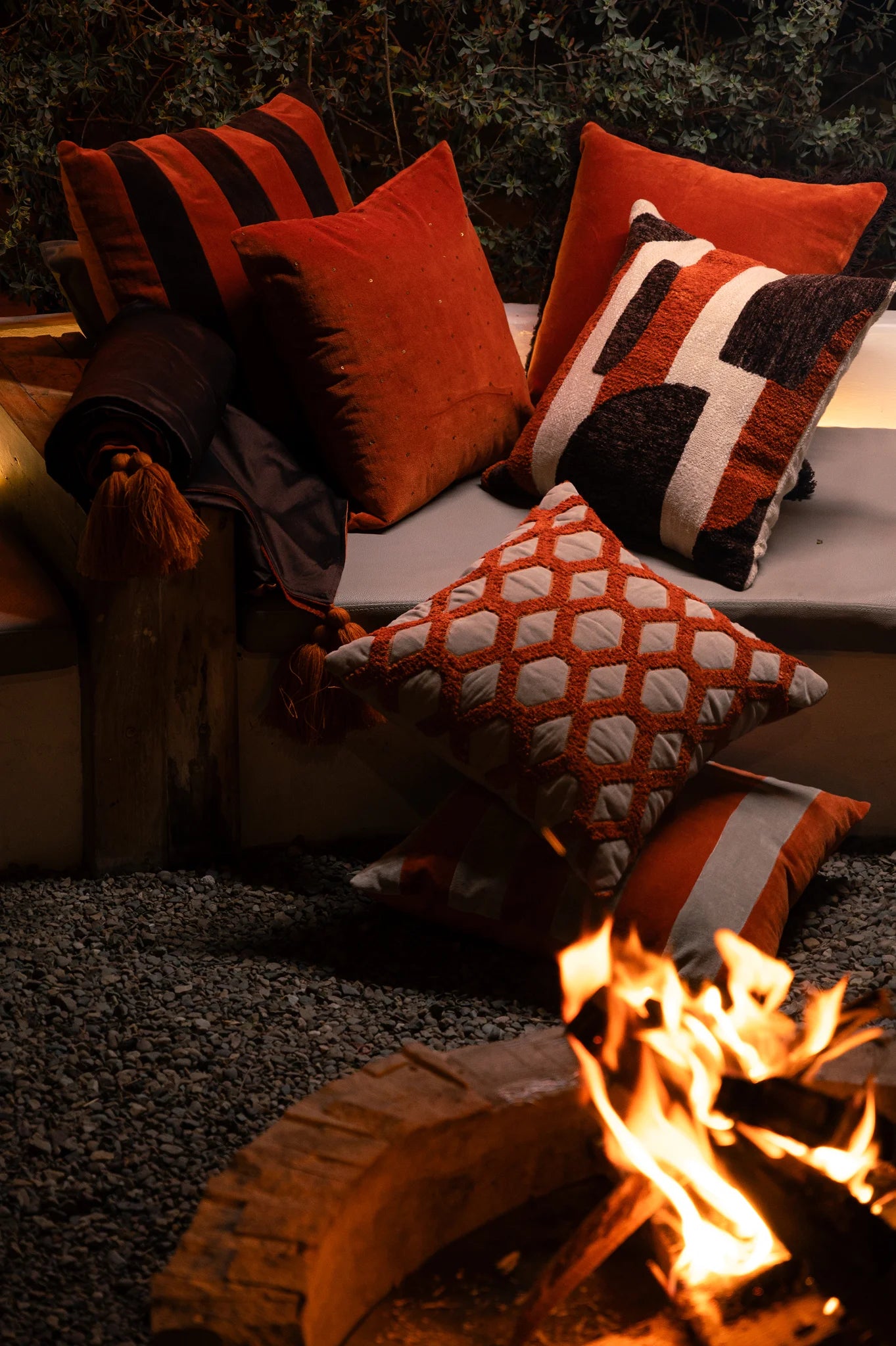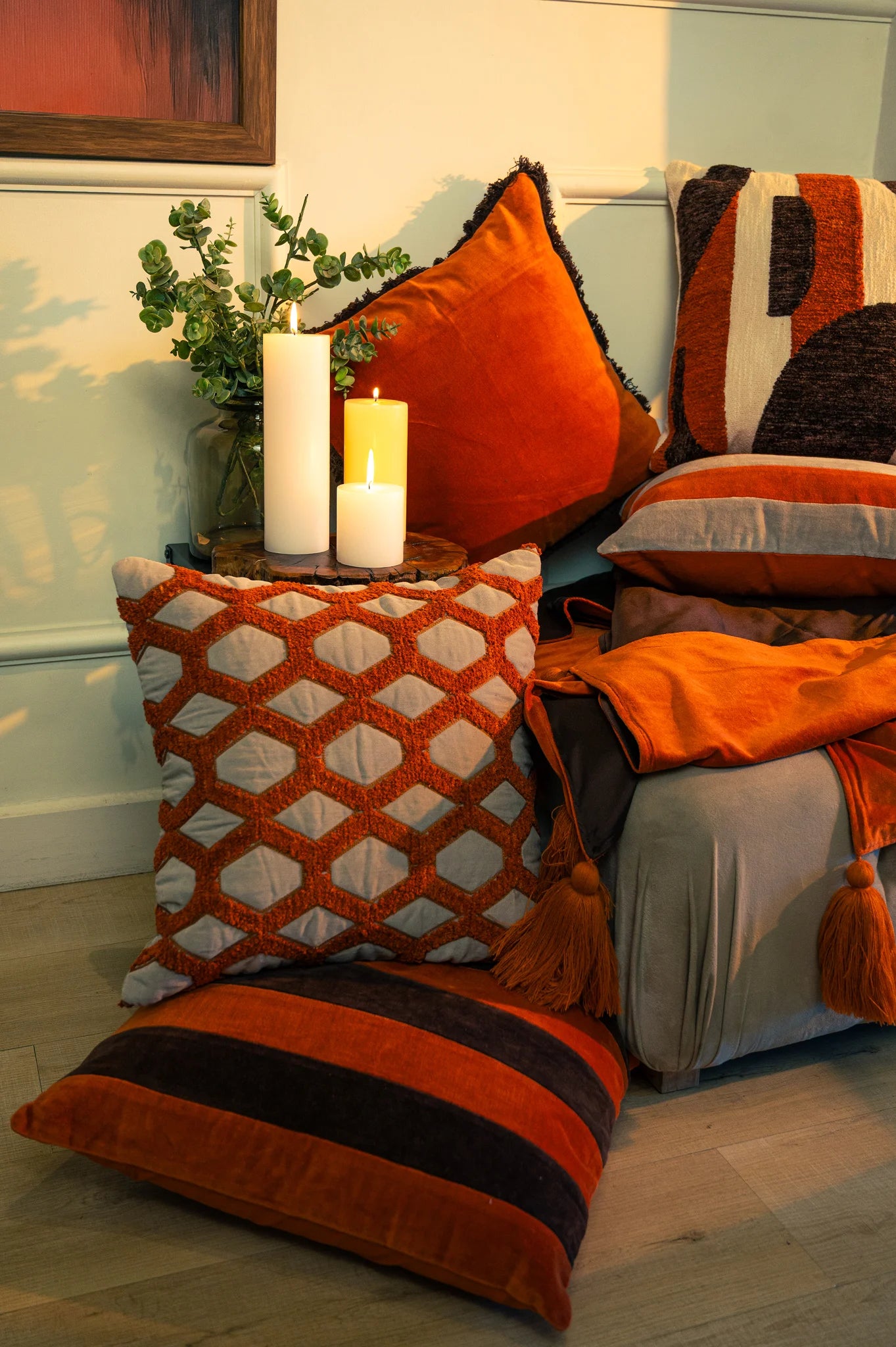 Vevro tilfører uanstrengt eleganse til interiøret ditt med et geometrisk fløyelsmønster i varme rusttoner over en myk beige base. Dette er en vakker pute som bringer både struktur og mykhet – ideell for deg som elsker et interiør med personlighet.
