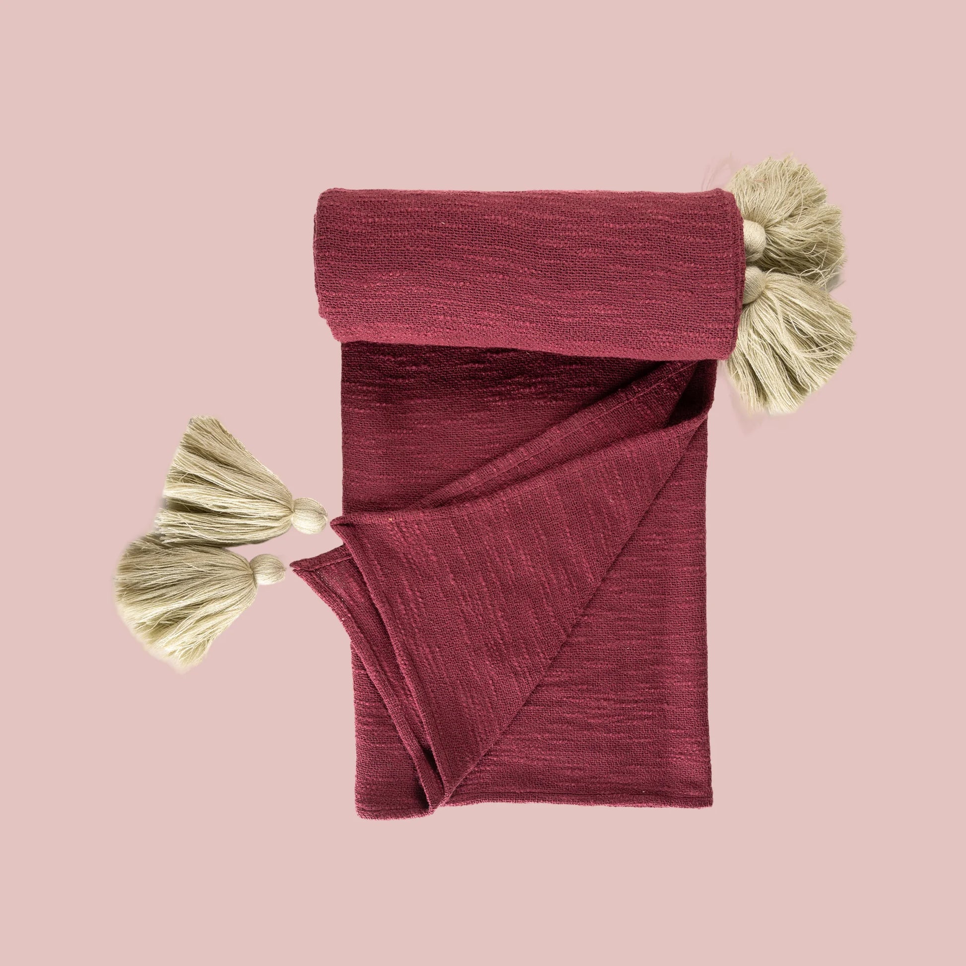 Farger: Mocha mousse, krem, burgunder med håndlagde dusker